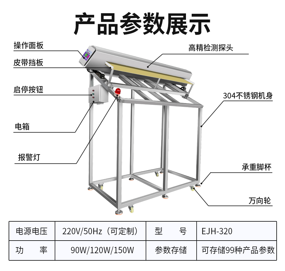 EJH-320系列全金屬檢測儀,可根據(jù)生產(chǎn)線需求配套定制窗口尺寸,檢測精度最大化,先進(jìn)數(shù)字信號(hào)處理技術(shù),有效克服產(chǎn)品效應(yīng),可精準(zhǔn)檢測鐵、不銹鋼、銅、鋁等金屬,靈敏度高達(dá)0.5mm,廣泛應(yīng)用在檢測肉類、水產(chǎn)、果蔬等食品加工過程中混入的金屬碎片、鐵絲等,精準(zhǔn)高效,為您徹底解決金屬異物隱患。