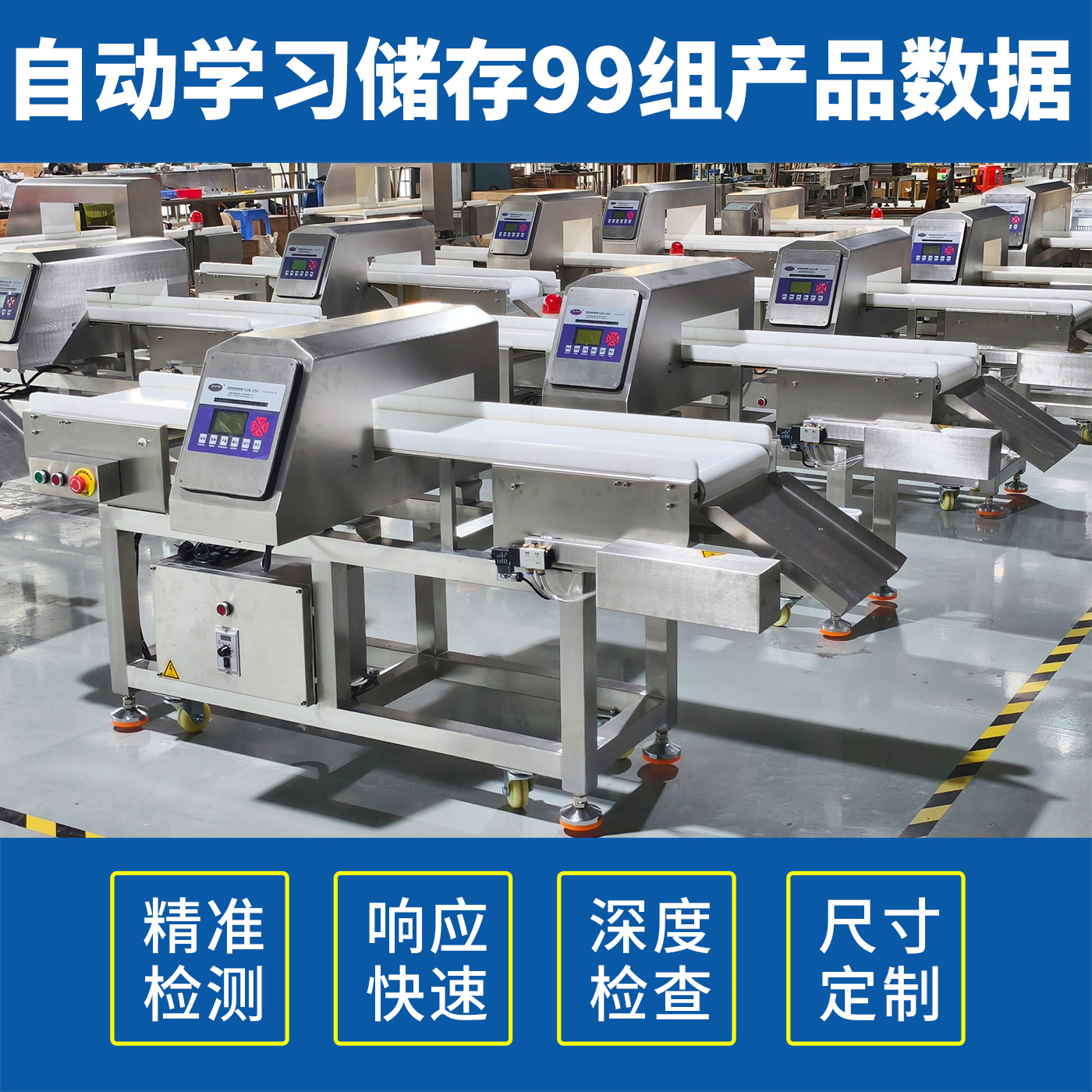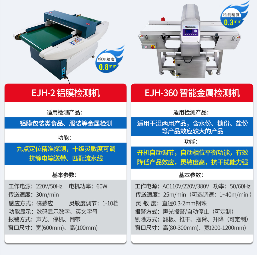 EJH-320系列全金屬檢測儀,可根據(jù)生產(chǎn)線需求配套定制窗口尺寸,檢測精度最大化,先進(jìn)數(shù)字信號處理技術(shù),有效克服產(chǎn)品效應(yīng),可精準(zhǔn)檢測鐵、不銹鋼、銅、鋁等金屬,靈敏度高達(dá)0.5mm,廣泛應(yīng)用在檢測肉類、水產(chǎn)、果蔬等食品加工過程中混入的金屬碎片、鐵絲等,精準(zhǔn)高效,為您徹底解決金屬異物隱患。