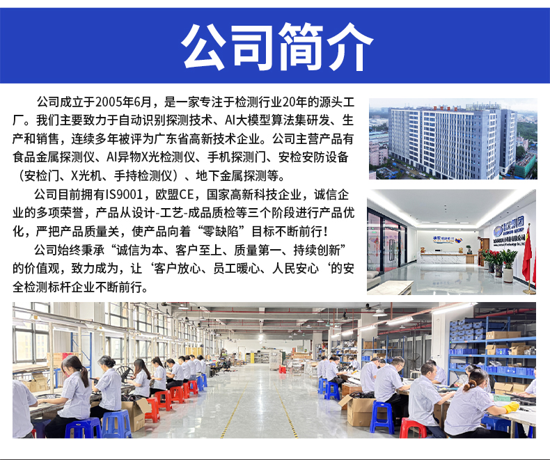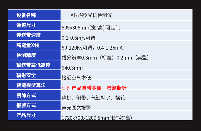 采用先進的AI智能算法頻技術,精準檢測斷針等金屬異物,靈敏度可達Fe 0.2mm,雙屏黑白高清成像,支持數(shù)據(jù)自動上傳服務器,檢測報表自動生成